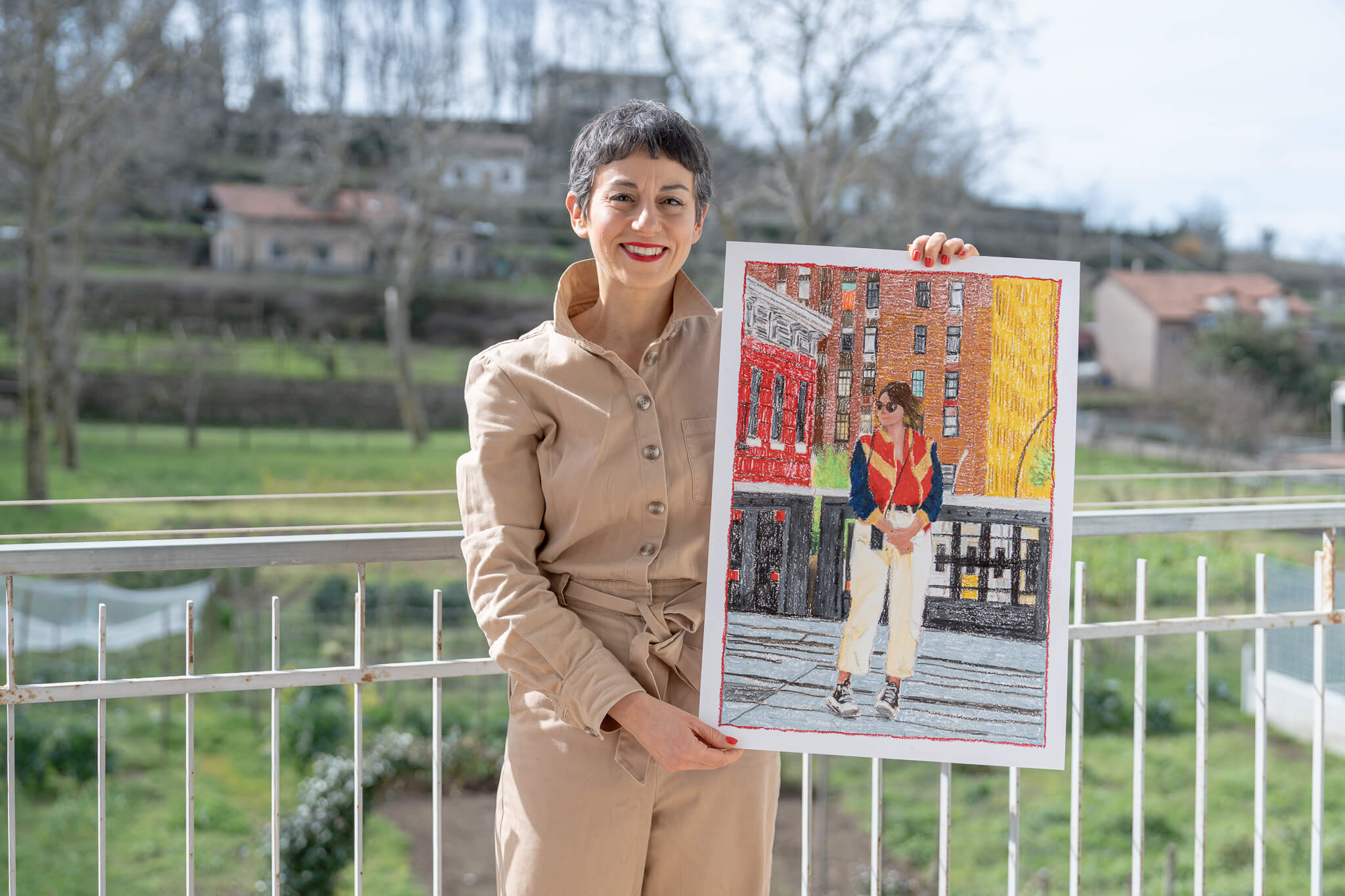Woman in tan jumpsuit holds drawing of another woman with buildings.