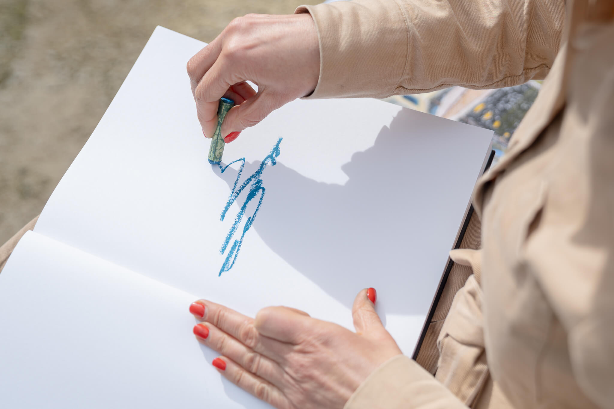 Person in tan jacket drawing with crayons on large paper.