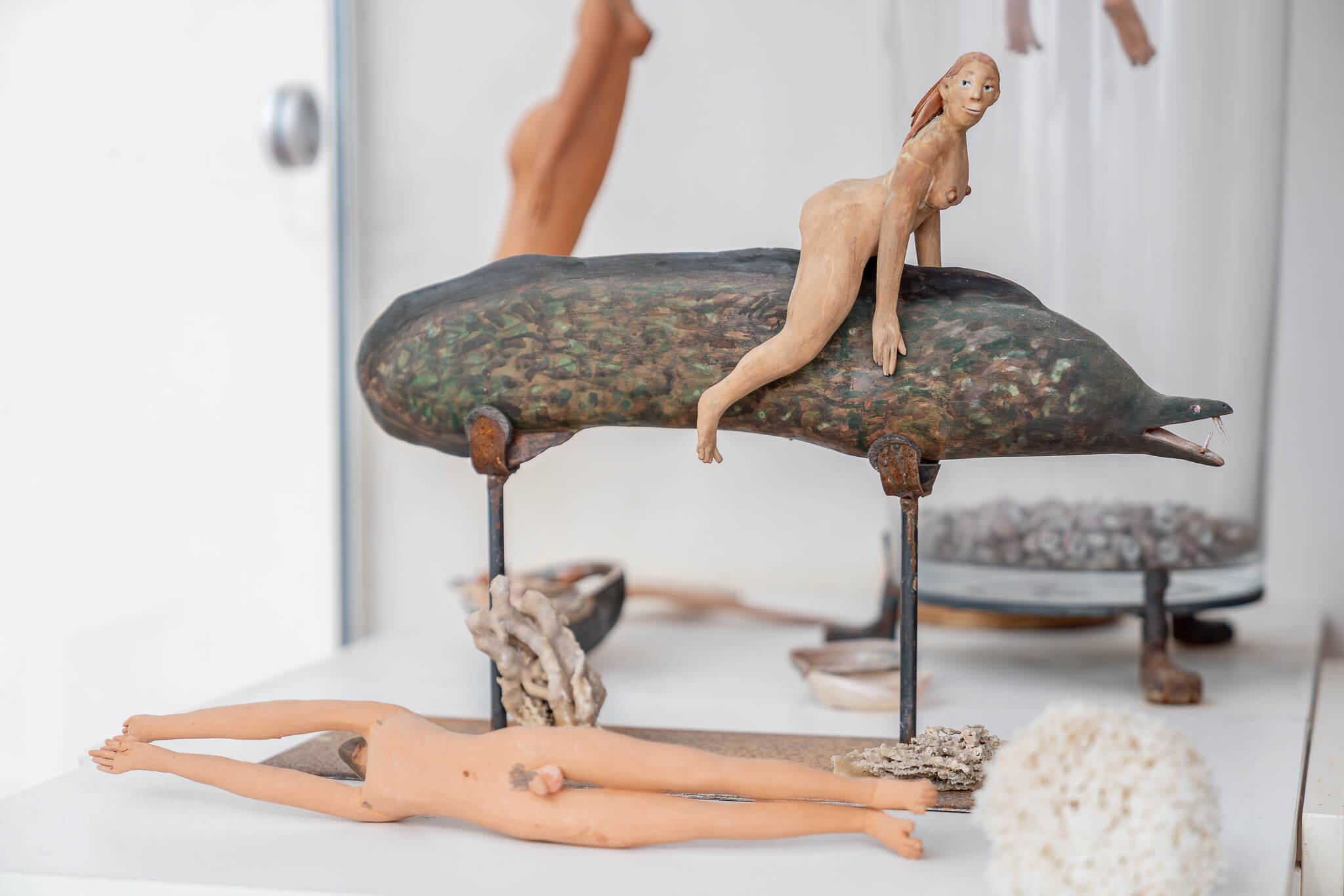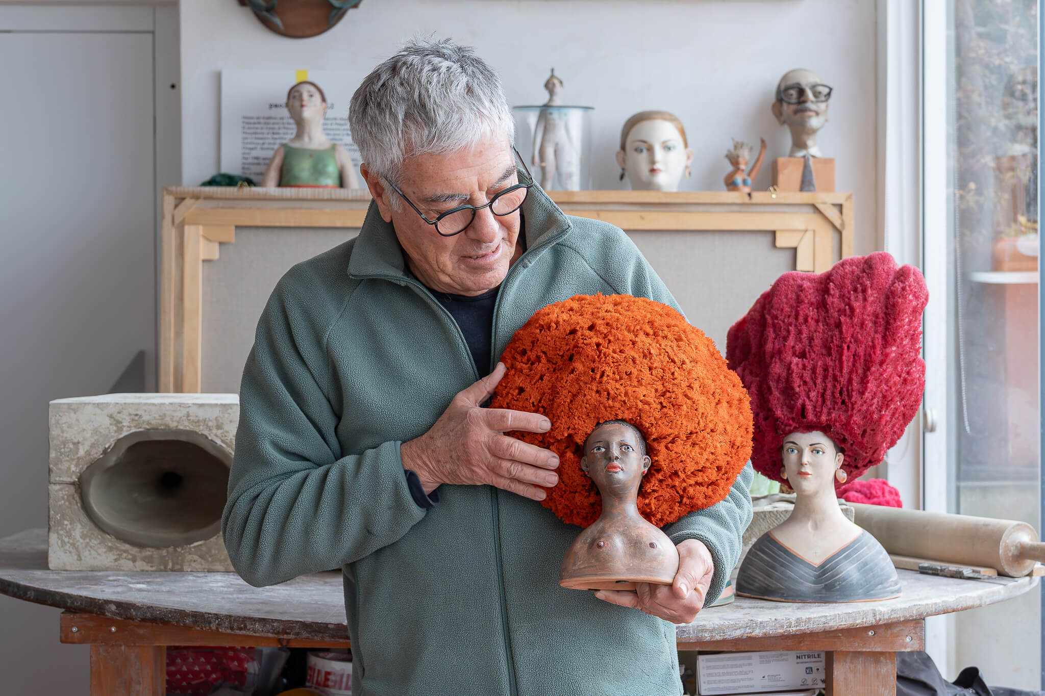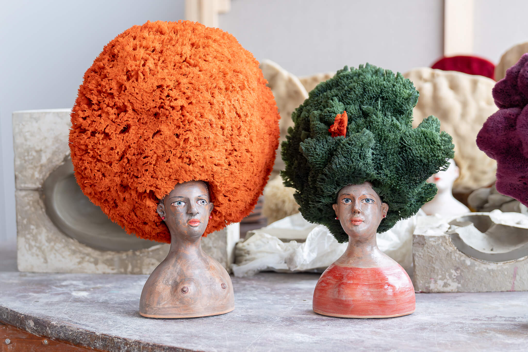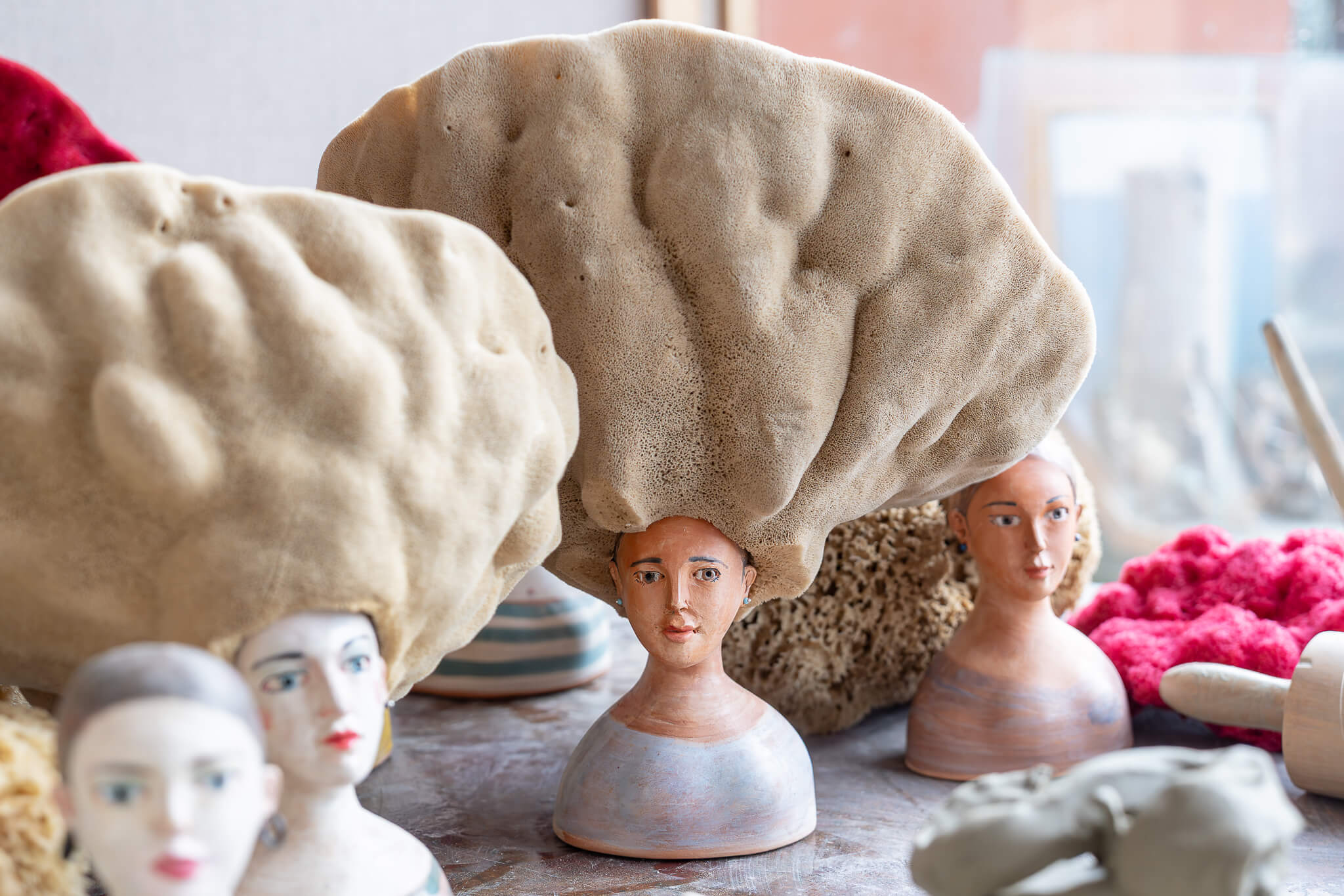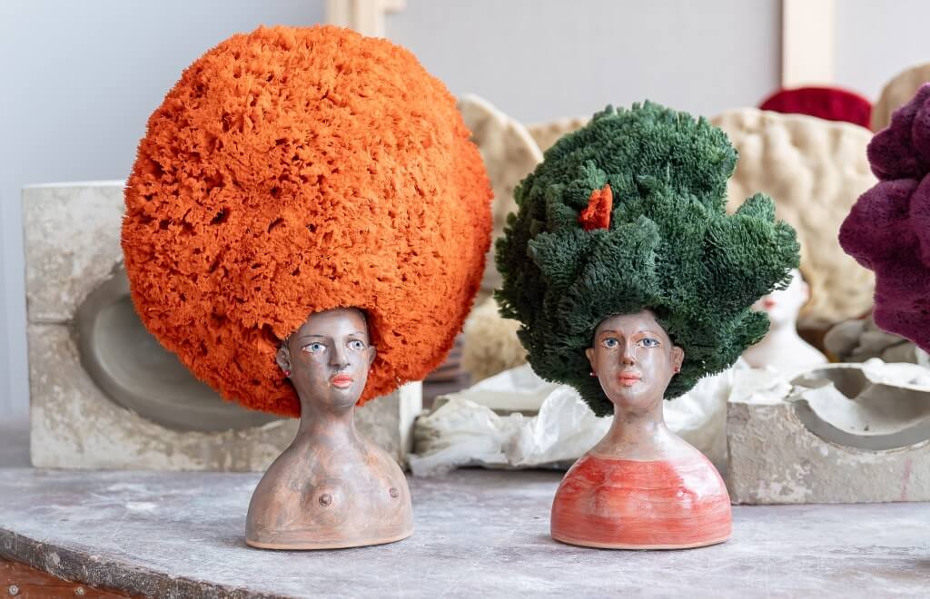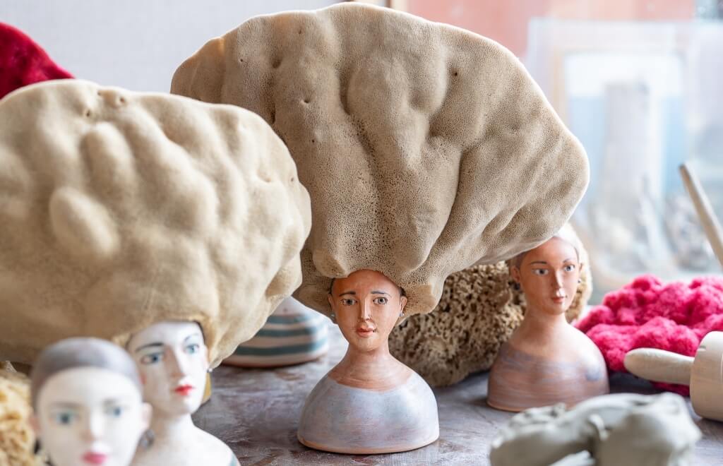 Sandulli's most iconic works are undoubtedly the Queens of the Sea: female terracotta busts crowned with colourful sea sponges that resemble exuberant, wild hairstyles. Each sculpture has a name, a personality, a biography of its own.