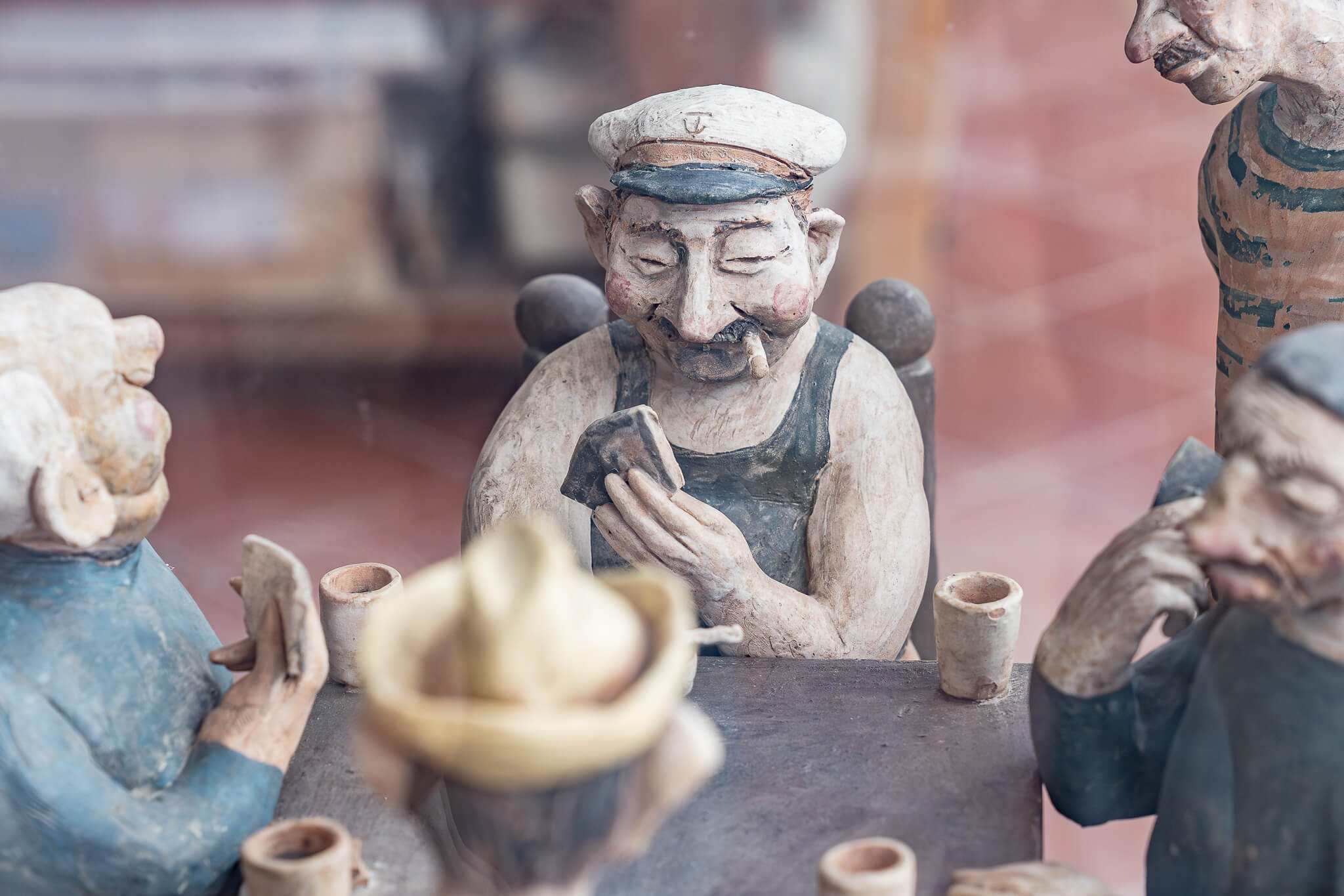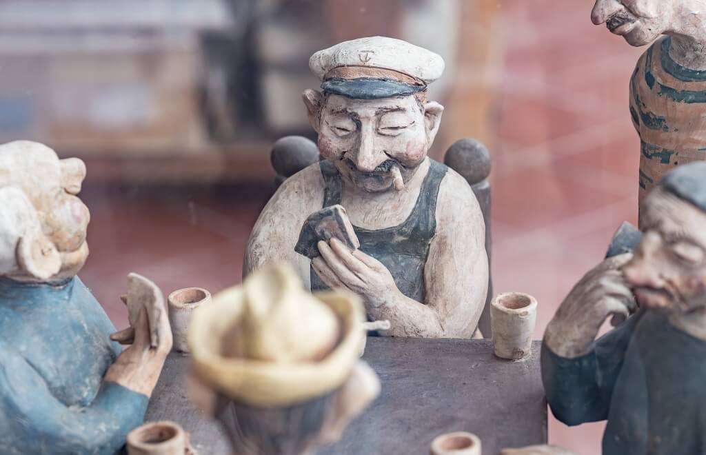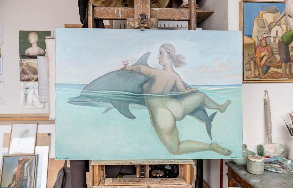 Other works include a portrait of our Suela in a vase created for the gardens of Palazzo Murat, scenes of fishermen playing cards, the vase of the two divers, and a mermaid caught by a fisherman who does not realise he has captured a mythological creature – a perfect metaphor for the relationship between reality and legend in these places.
